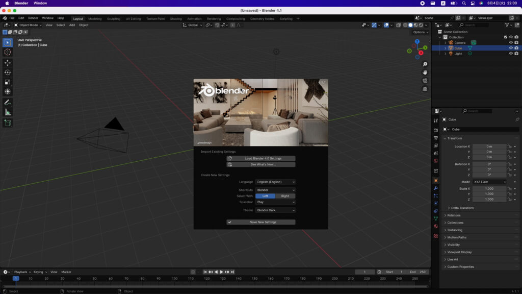 Blenderを開くとデフォルトでキューブ、カメラ、ライトが表示されていますが、不要な場合は初期画面で表示しないようにすることができます。
