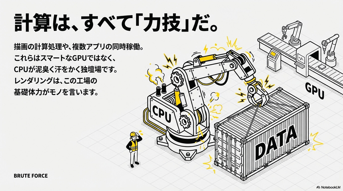 CPUが本気を出すのは、レンダリングなどの「計算処理」や、たくさんのソフトを同時に立ち上げているとき。