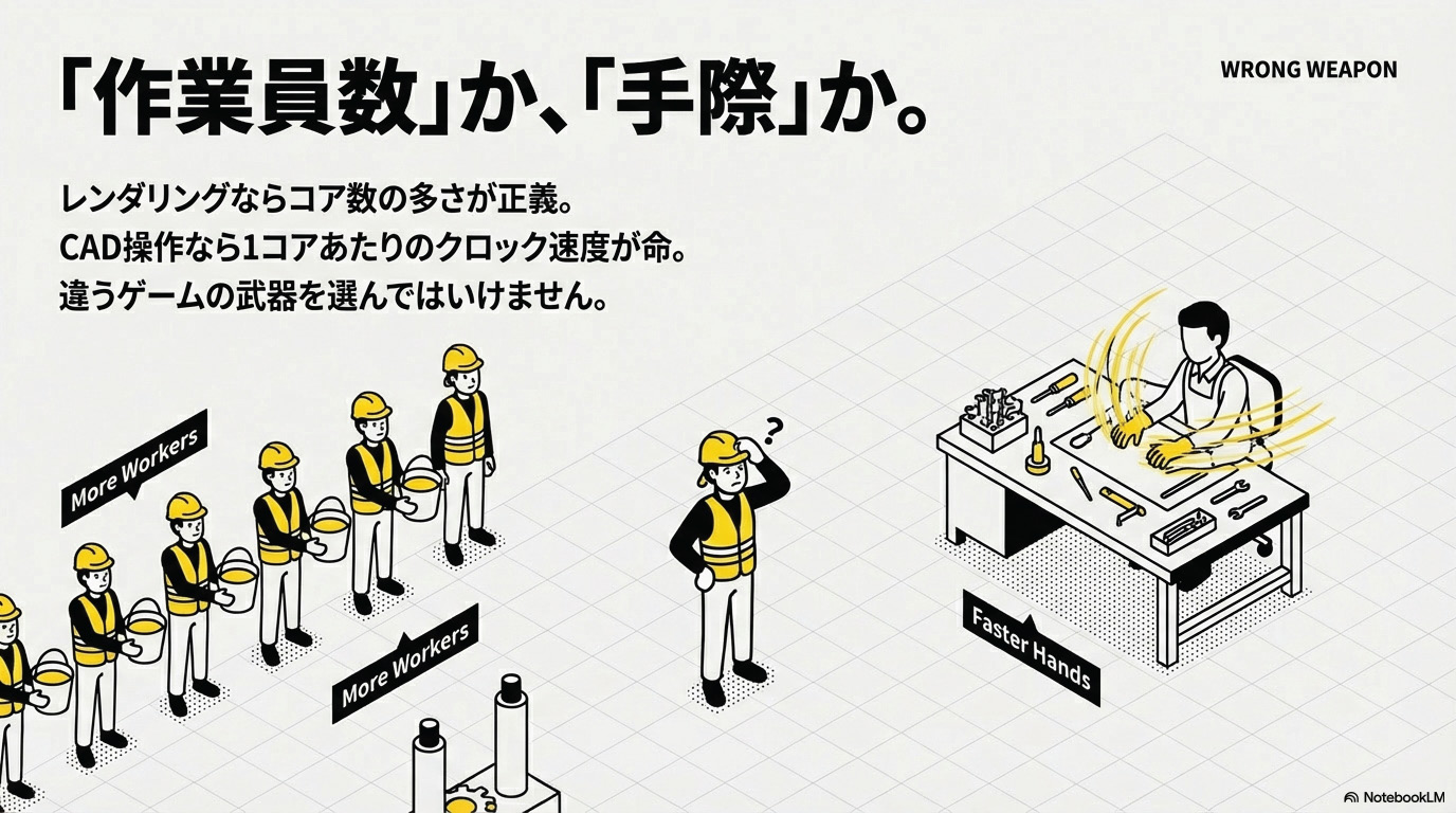 CPU選びで一番悩むのがこれ。「コア数(同時に処理できる人数)」と「クロック数(1人あたりの処理速度)」、どっちを取るか。