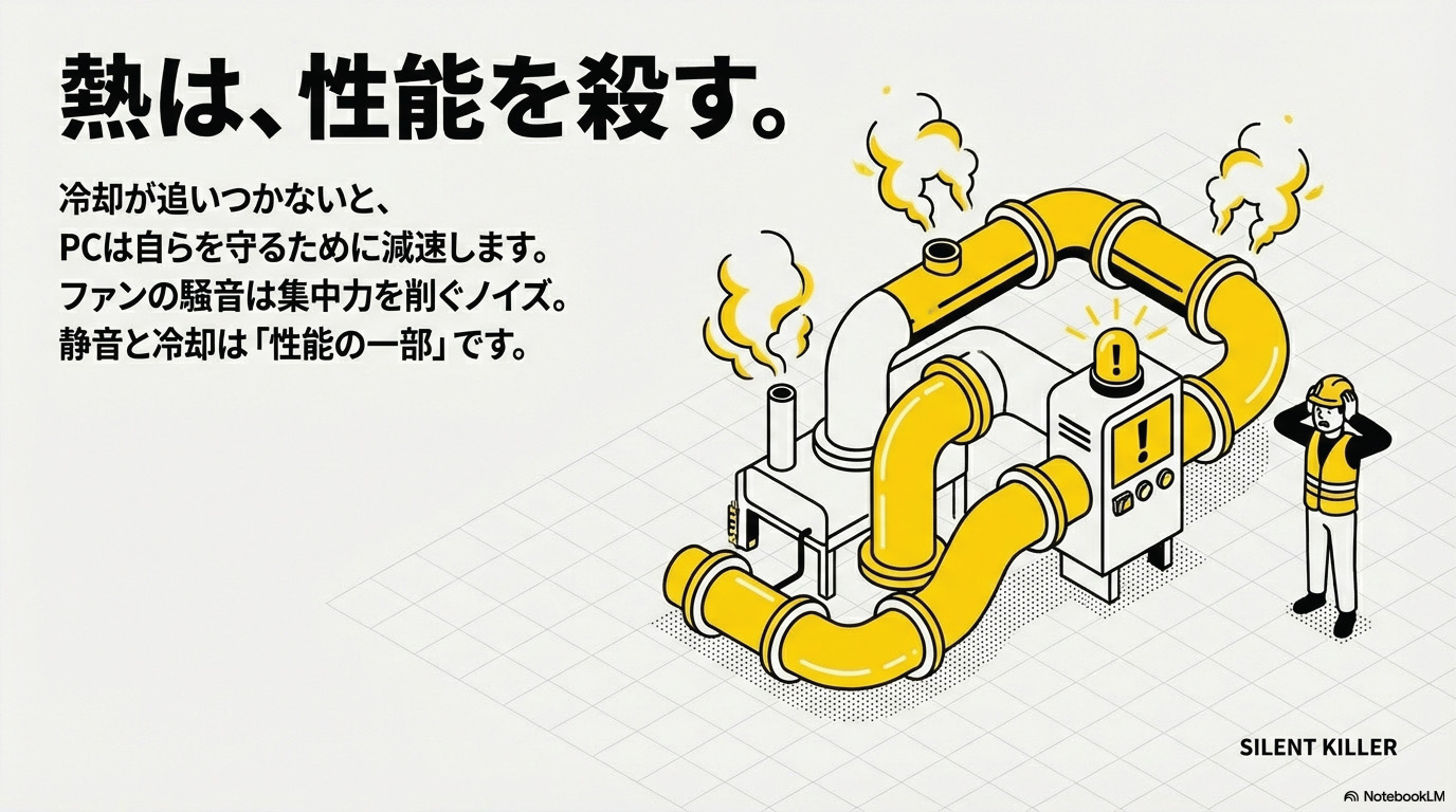 それに、ファンの音が「ブォォォン!」ってうるさいと、集中できないでしょ? 静音ケースや静音ファンへの投資は、あなたの「精神衛生」への投資でもあるのよ。
