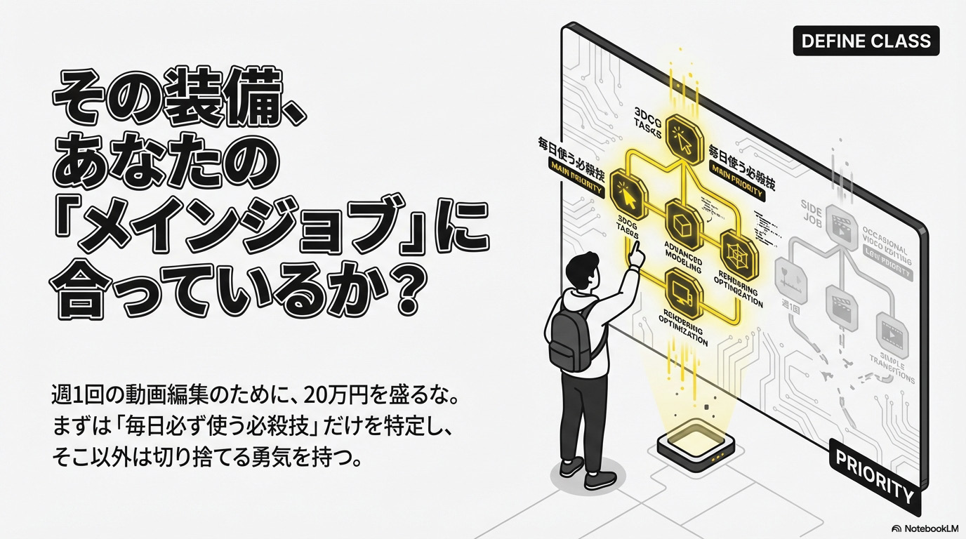 例えば、3DCGを作るなら高性能なGPUや大画面モニタが必要不可欠。でも、いくら良いPCを買っても、作業デスクが狭くてマウスパッドが置けなかったり、ケーブルがスパゲッティみたいに絡まっていたら、物理的なストレスで集中力が切れるでしょ?