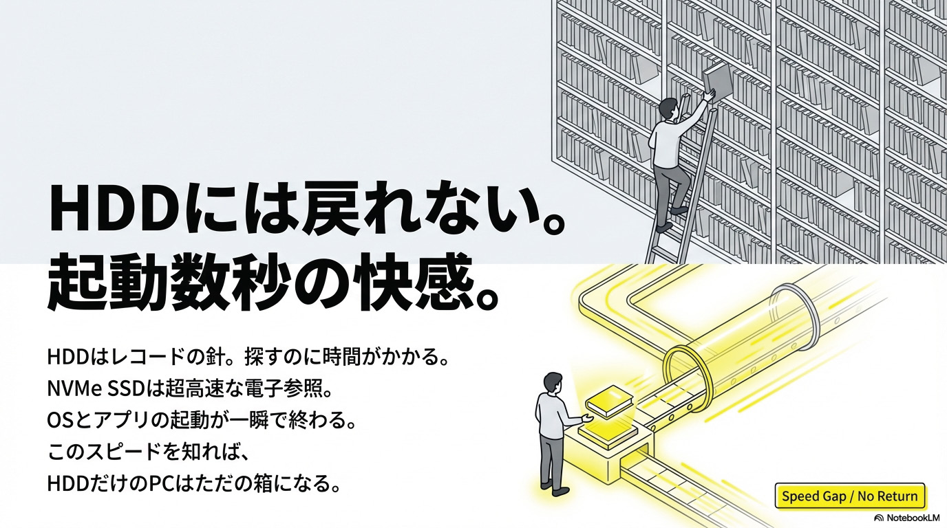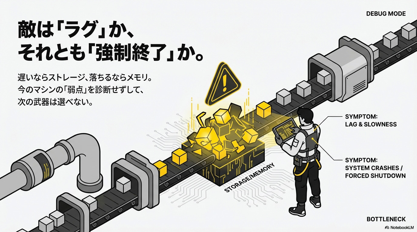 - 「起動が遅い、ファイルが開かない」→ ストレージ(SSD化) が最優先