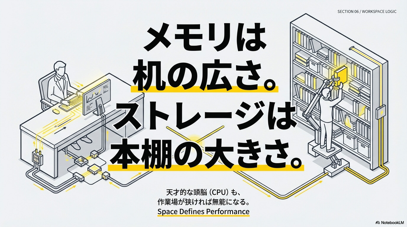 - メモリ: 机が狭すぎれば、いちいち引き出し(ストレージ)を開け閉めしなきゃいけない。