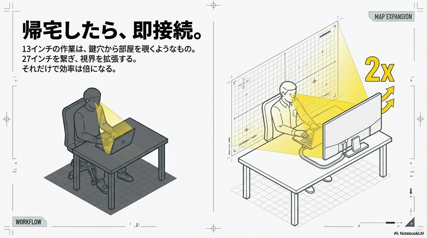一つだけ約束して。家で作業するときは、必ず「外部モニタ」に繋ぐこと。