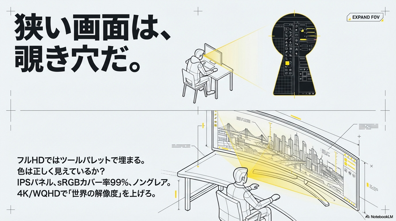 13インチや15インチの小さな画面だけで作業するのは、鍵穴から部屋の中を覗いているようなもの。