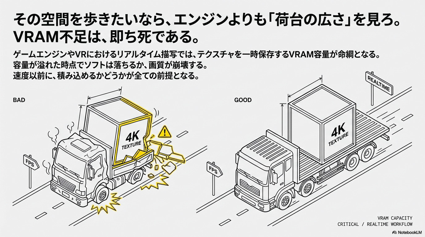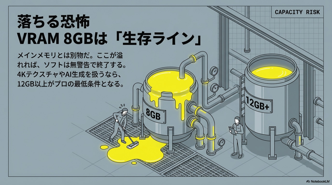 ここでは「VRAM(ビデオメモリ)」の容量が、生死を分けるわ。