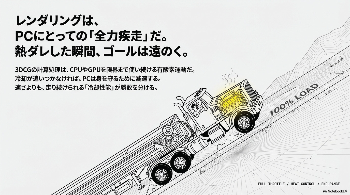 これはCPU(またはGPU)を100%フル稼働させる作業。光の反射や影を計算するこの時間は、PCにとって「全力疾走」の状態。冷却が追いつかないと、サーマルスロットリング(熱暴走防止のための減速)が起きて、いつまで経っても終わらないわよ。