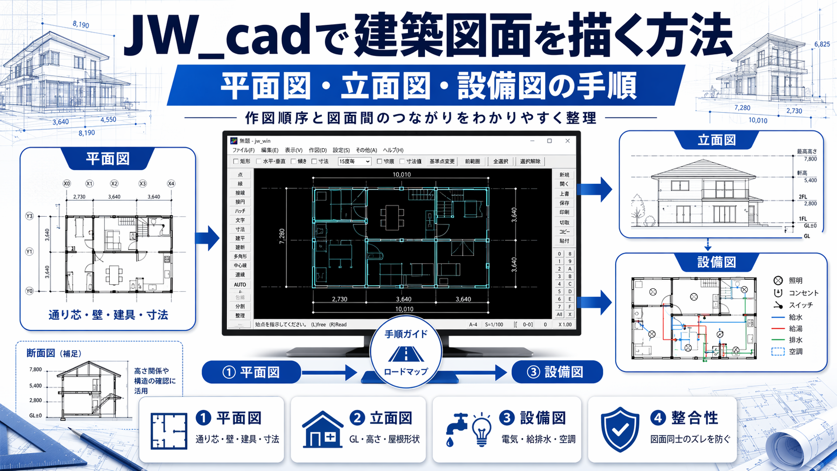 この記事を読むと、JW_cadで建築図面一式を描く全体ロードマップを、作図順序・図面間整合性の管理・設備図やリフォーム図までのカバー範囲という3つの軸で確認できます。
