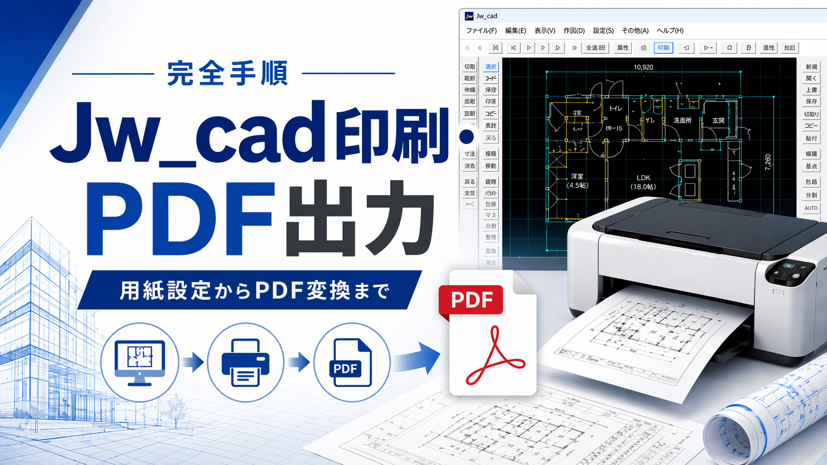 この記事を読むと、Jw_cadの印刷コマンドの基本操作からPDF変換(Microsoft Print to PDF / CubePDF)、連続印刷、印刷前チェックリストまでを順番に確認できます。